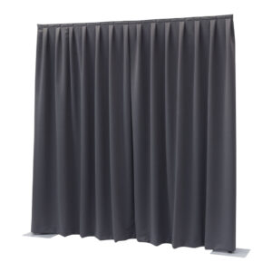 Pipe & Drape FOH set zwart is een verstelbaar systeem met een vaste hoogte (120 cm) en 2 variabele in breedte in te stellen breedtes (120 – 180 cm en 90 – 120 cm).