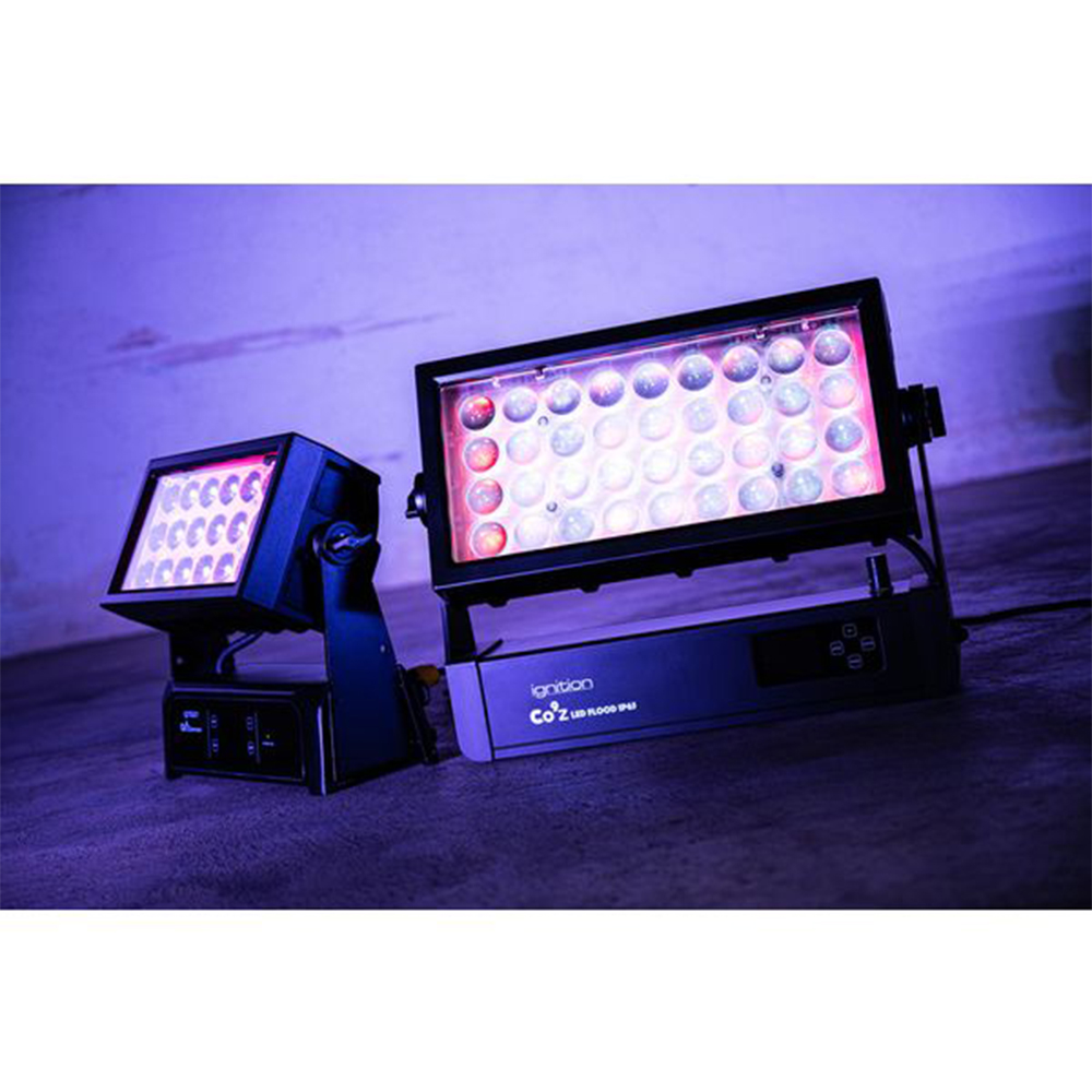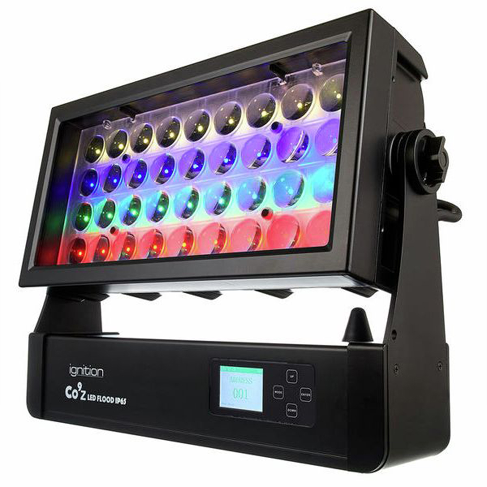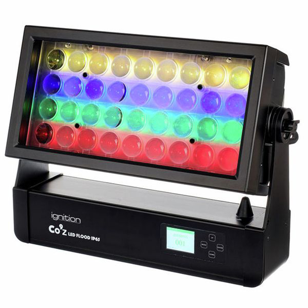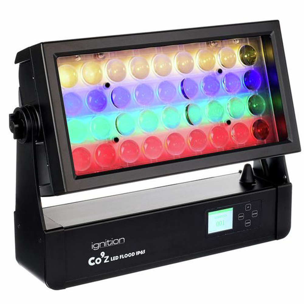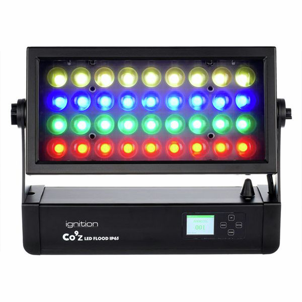 Ignition Co9Z LED flood zoom beschikt over 36x 15W RGBW LED en 72x 0.2W RGB LED’s voor achtergrondverlichting en 4 individueel bestuurbare horizontale secties.
